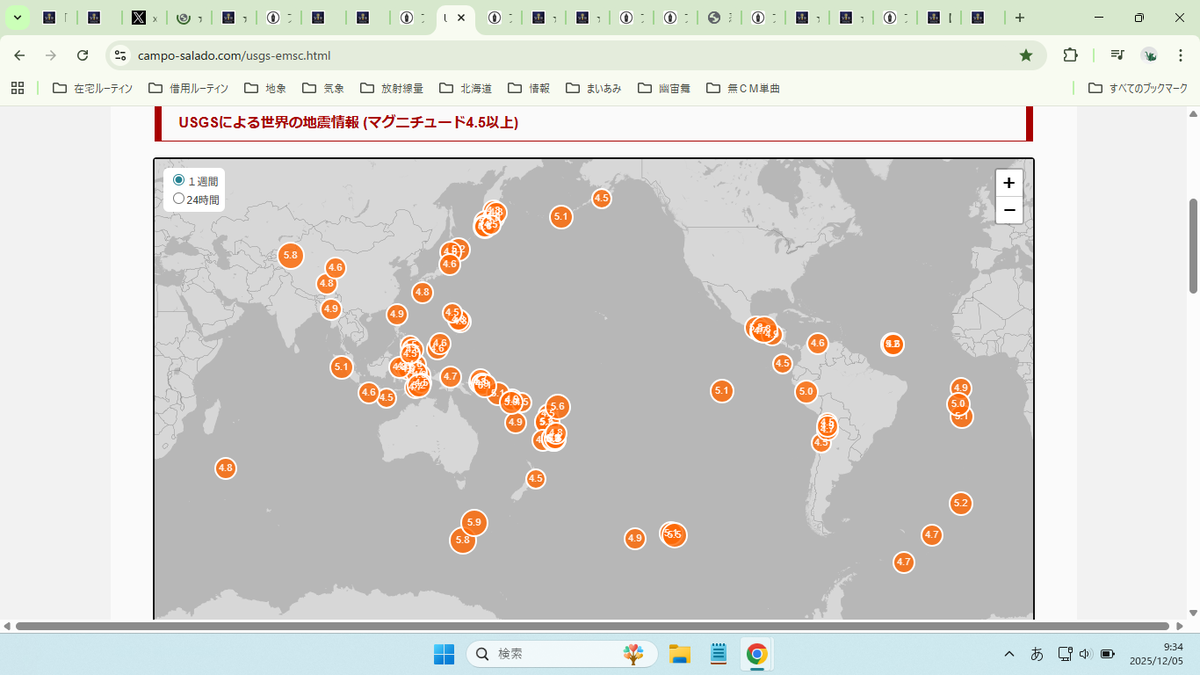 2025-12-05 ★【 道南東 南西海 警戒 】★/★【 地震が 多すぎる。 】★ 23:【 地震 】( 全 地球 ) 24:【 地震 】( 日本 列島 弧 ) 25:【 噴火 】(+ 噴火津波 ) 20:【 地象・天象/宇宙気象 】(旧:【 時事ニュース 】 ) 33:◆【 情報は ベクレ てる 】★ ( ※「 情報には ベクトル 」 ) 39:【 サバイバル 情報 】( ≒ 健康(自己)管理) (旧:【家族・子育て】 ) =============== https://www.hinet.bosai.go.jp/hypomap/?LANG=ja =============== https://earthquake.tenki.jp/bousai/earthquake/seismicity-map/ =============== https://campo-salado.com/usgs-emsc.html =============== https://campo-salado.com/usgs-emsc.html ===============